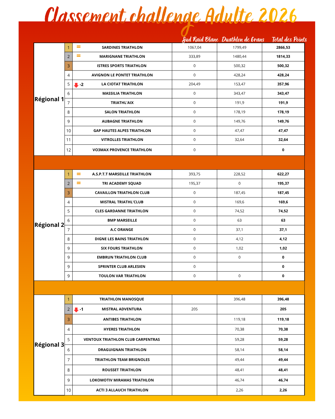 CLASSEMENT 2026 CHALLENGE RÉGIONAL ADULTES